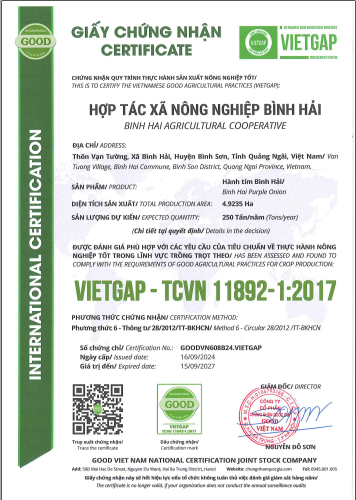 Vùng trồng Bình Hải đạt chứng nhận GOODVN608B24.VIETGAP (16/09/2024), khẳng định quy trình sản xuất an toàn, minh bạch và có thể truy xuất nguồn gốc đầy đủ – “tấm hộ chiếu” giúp sản phẩm tự tin tiến vào hệ thống phân phối lớn và xuất khẩu.